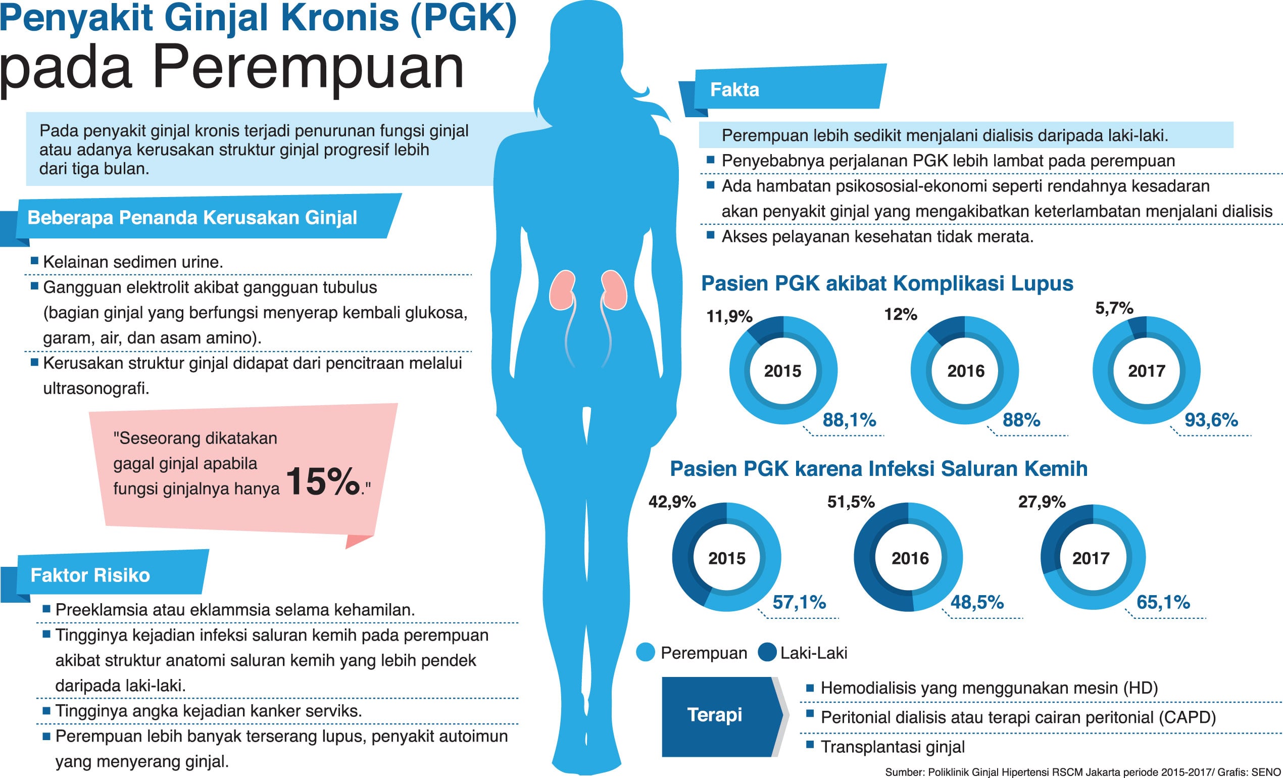 PARA perempuan yang mengalami preeklamsia (eklamsia selama kehamilan), infeksi saluran kemih, dan kanker serviks, serta menderita lupus (autoimun) harus menyadari betul bagaimana menata penyakit-penyakit tersebut. Mereka berisiko terkena penyakit ginjal kronis (PGK).