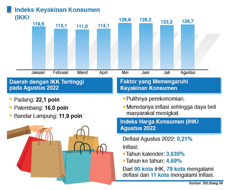 Indeks Keyakinan Konsumen (IKK) Agustus 2022 sebesar 124,7 atau lebih tinggi dibandingkan 123,2 pada Juli 2022