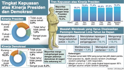 Survei terbaru LSI memotret evaluasi publik terhadap kinerja presiden Joko Widodo dan menunjukan kepuasan masyarakat terhadap kinerja presiden yang mencapai 72,3 persen