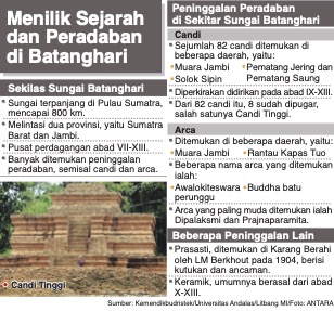 Jejak peradaban banyak ditemukan di sepanjang Sungai Batanghari. Salah satunya Kompleks Percandian Muarajambi.
