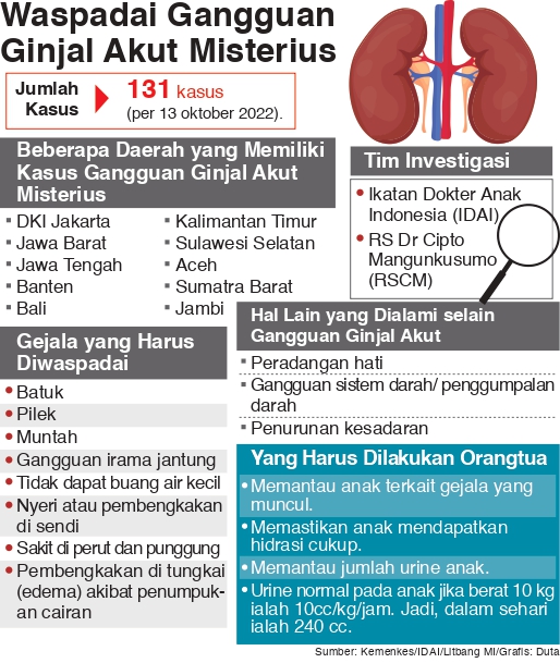Ikatan Dokter Anak Indonesia mendapatkan laporan dari 14 IDAI cabang mengenai adabya 131 kasus gagal ginjal akut yang misterius.