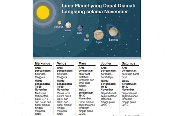 SEPANJANG November 2020, lima planet, yakni Merkurius, Venus, Mars, Jupiter, dan Saturnus bisa dilihat dengan mata telanjang