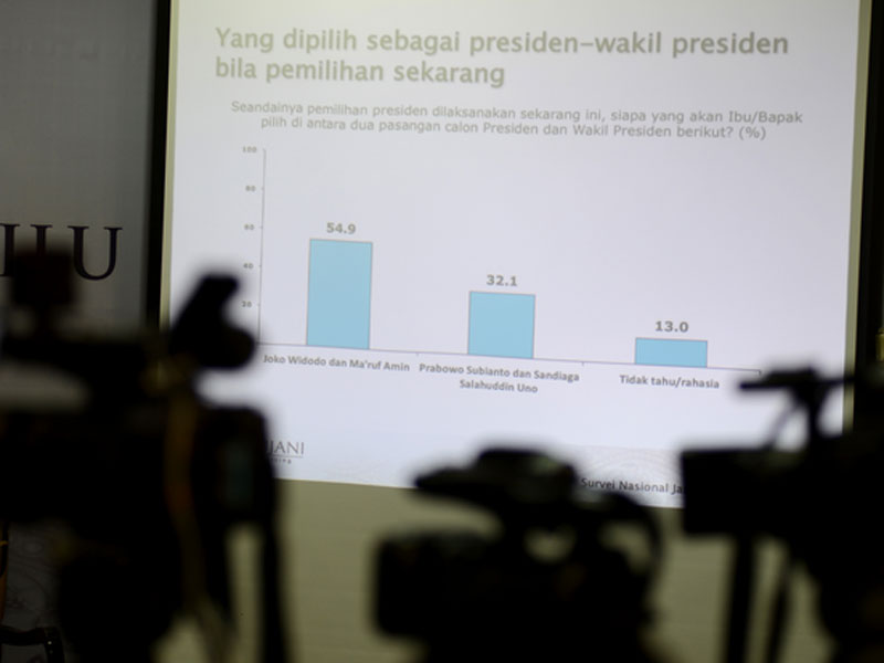 Hasil sigi teranyar lembaga survei Saiful Mujani Research and Consulting (SMRC) mencatat elektabilitas pasangan calon Joko Widodo (Jokowi)- Ma'ruf Amin tetap unggul jauh dari pasangan Prabowo Subianto-Sandiaga Uno di Pilpres 2019.