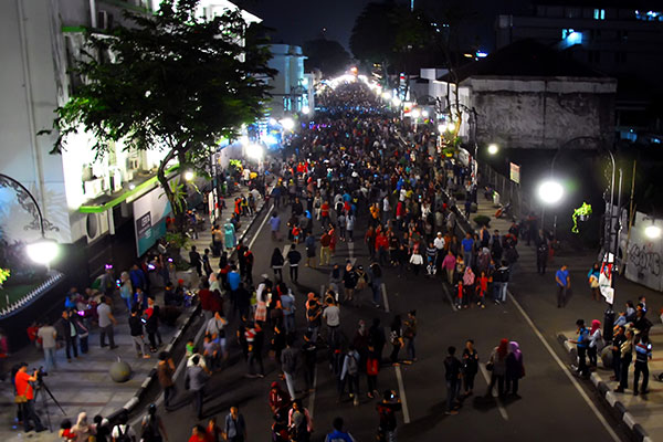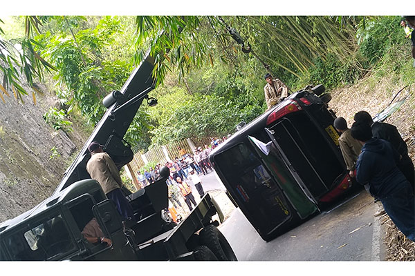BERUSAHA menghindari pemotor yang nyaris tertabrak, bus pariwisata yang mengangkut rombongan pelajar asal Tangerang terguling di tanjakan Jl. Kolonel Mastur