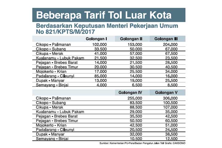 PEMERINTAH mengupayakan penurunan tarif tol dengan menyederhanakan golongan kendaraan yang melalui jalan bebas hambatan di luar wilayah Jabodetabek.