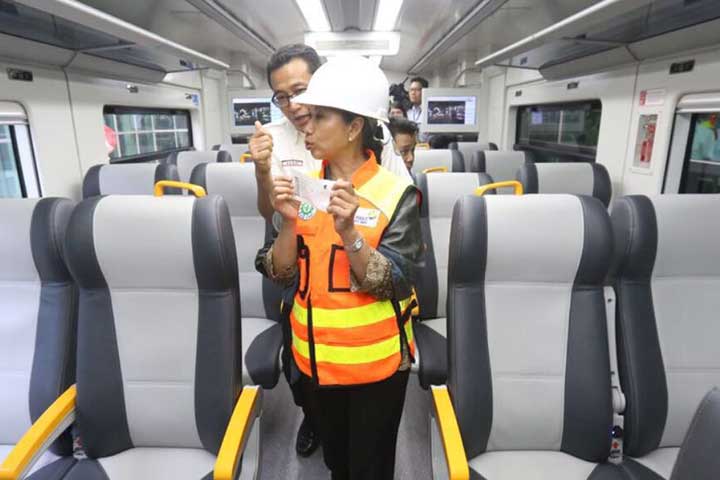 MENTERI Badan Usaha Milik Negara (BUMN) Rini Soemarno melakukan uji coba Kereta Bandara Soekarno-Hatta, Selasa (28/11).