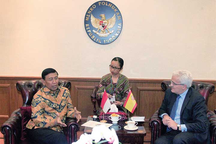 WAKIL Menteri Luar Negeri Spanyol Idelfonso Castro menemui Menteri Koordinator Bidang Politik, Hukum, dan Keamanan Wiranto, di Kantor Kemenko Polhukam, Jakarta, Jumat (17/11)