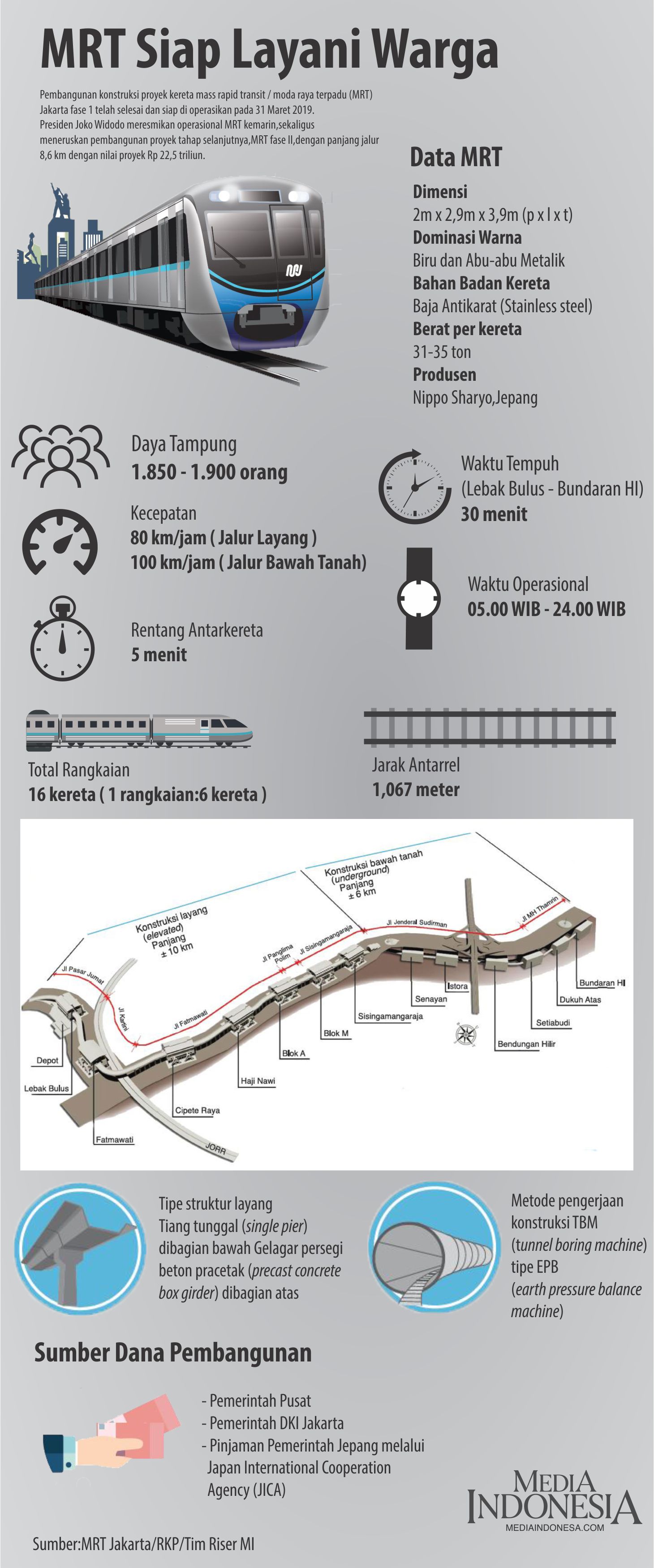 Pembangunan konstruksi proyek mass rapid transit/ moda raya terpadu (MRT) Jakarta fase 1 telah selesai dan dioperasikan pada 31 Mareet 2019.