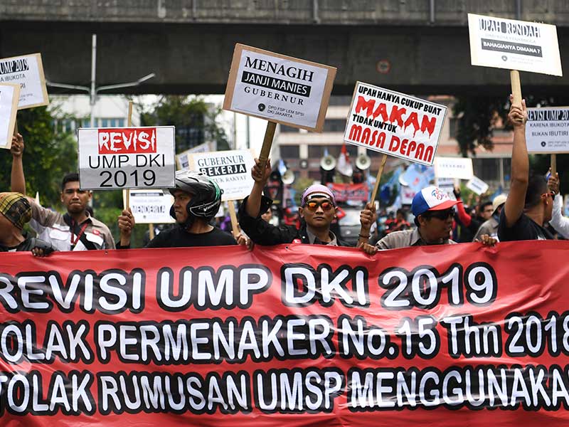 MASSA buruh Federasi Serikat Pekerja (FSP) Logam, Elektronik, dan Mesin (LEM) Serikat Pekerja Seluruh Indonesia (SPSI) menagih janji Gubernur DKI Jakarta, Anies Baswedan, soal kenaikan upah khusus pekerja LEM bersama buruh lainnya.