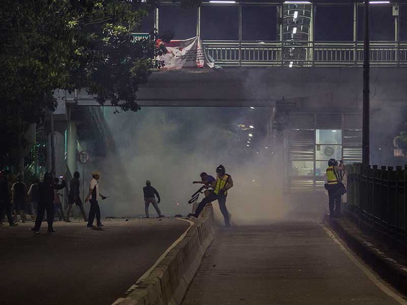 PETANG belum lama datang, saat beberapa tiang listrik dipukuli warga Tenggulun, Kelurahan Menteng Jaya, Menteng, Jakarta Pusat, Kamis (23/8).