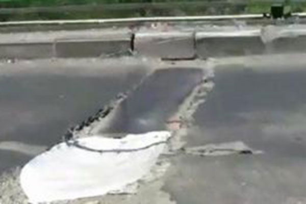 Penghubung ruas jalan dengan jembatan layang yang rawan ambruk itu mengalami renggang sekitar 20 cm. Bahkan di pondasi jembatan sisi timur dan barat terlihat keretakan antara 3 hingga 4 cm.