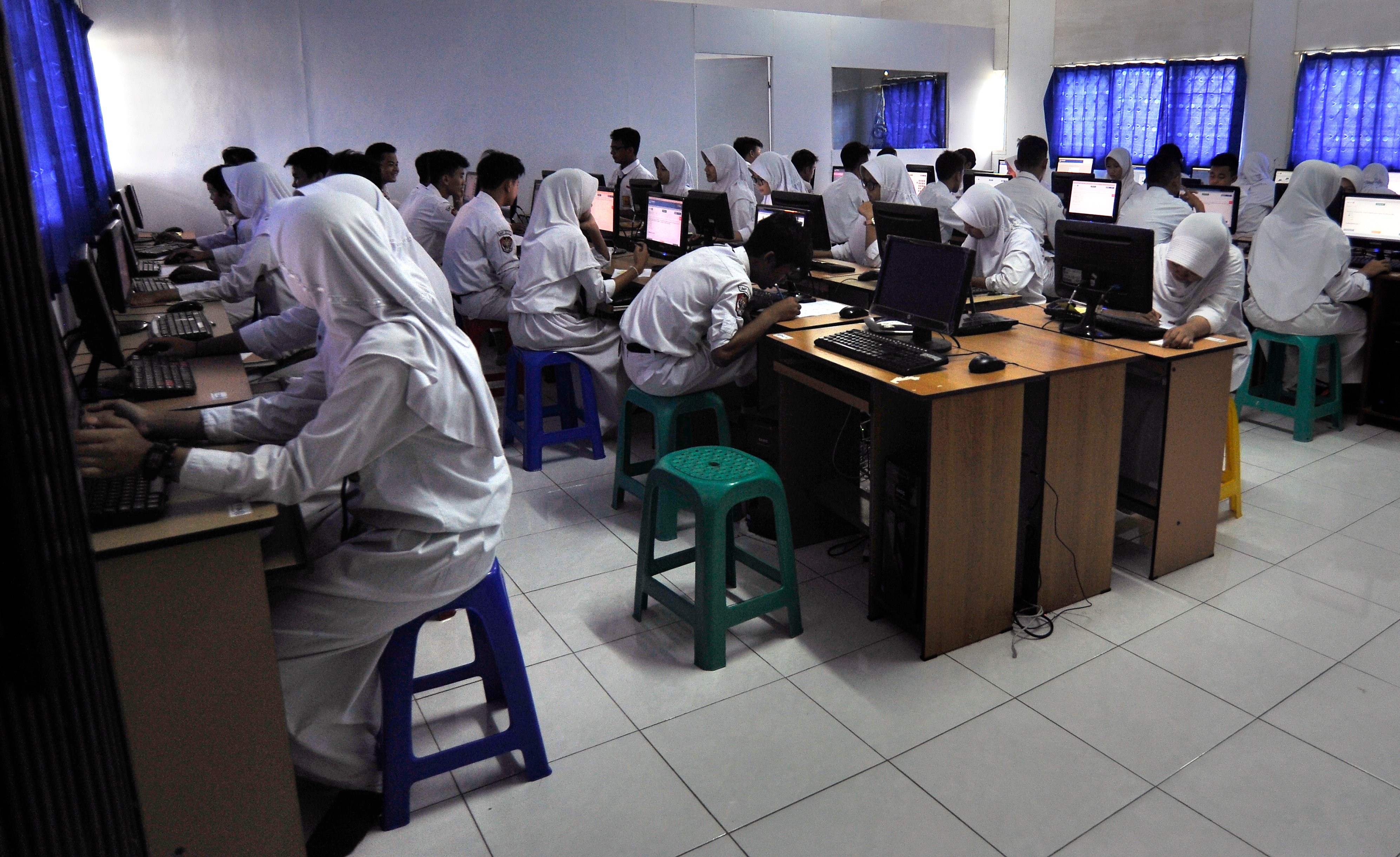 PELAKSANAAN Ujian Nasional Berbasis Komputer (UNBK) di 28 SMP Negeri di Kota Bekasi masih menumpang ke sekolah lain. Sebabnya, anggaran pembelian komputer sebesar Rp39 miliar belum terserap.