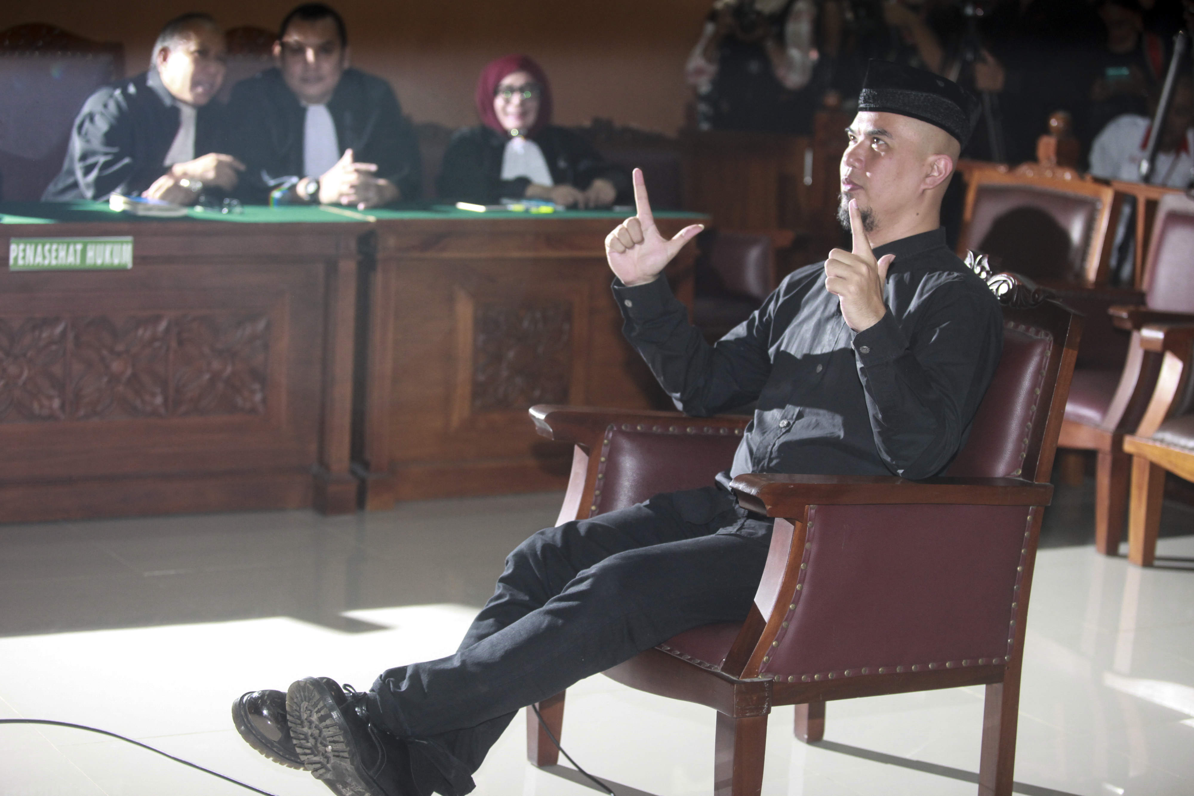 AHMAD Dhani kembali menjalani sidang perkara ujaran kebencian di Pengadilan Negeri Jakarta Selatan, Senin (23/4). Dalam agenda pembacaan eksepsi itu, musisi pentolan grup band Dewa 19 itu yakin doa seluruh habib menyertainya.
