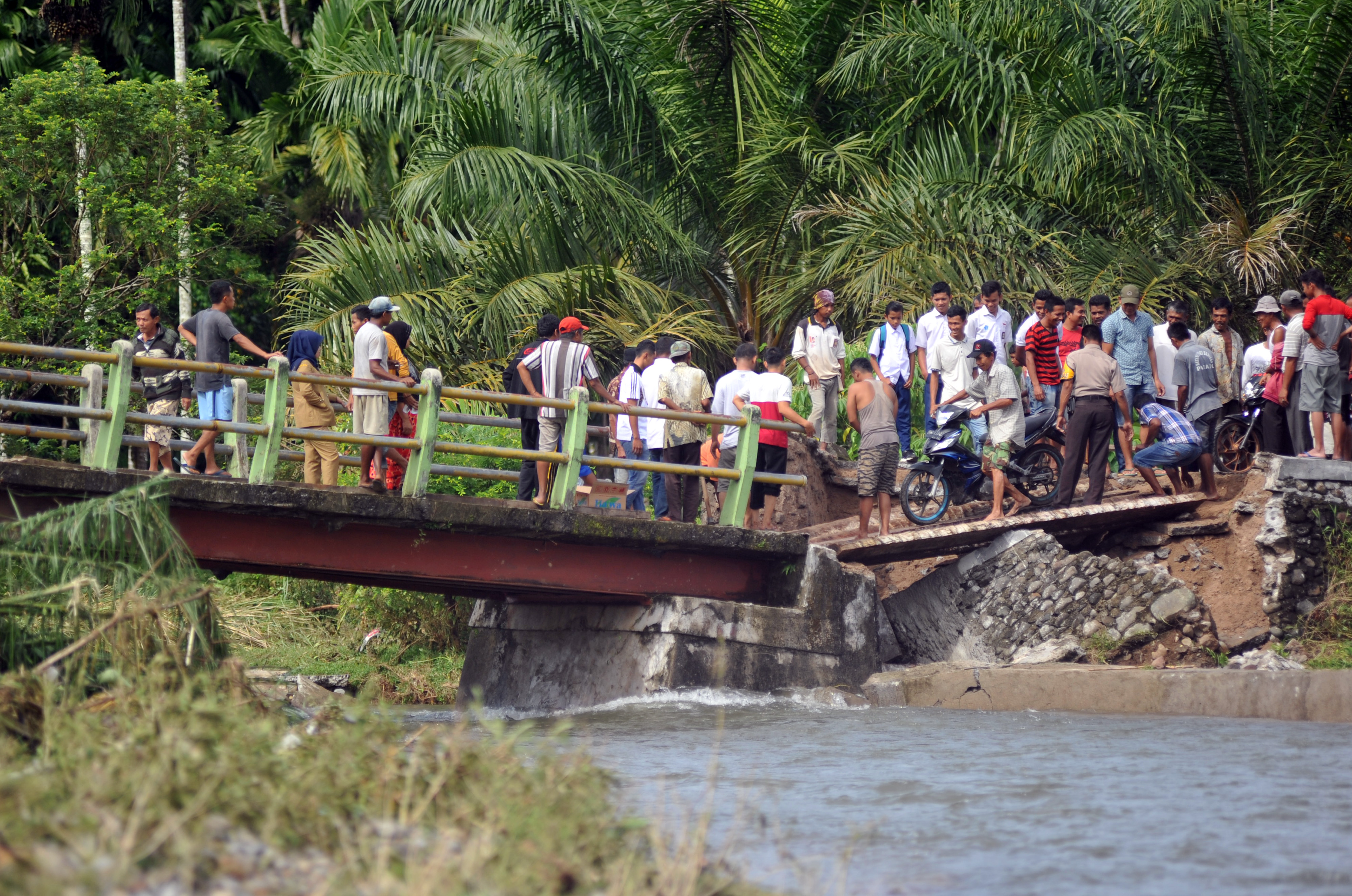 Sebuah jembatan sepanjang lebih dari 20 meter yang menghubungkan dua desa di Kabupaten Indragiri Hilir, Provinsi Riau, terputus akibat longsor yang melanda wilayah itu.