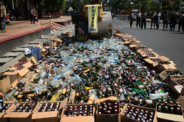 MENJELANG bulan Ramadhan 1439 Hijriah, Wali Kota Depok Idris Abdul Shomad dan Kepala Polres Kota Depok Komisaris besar Didik Sugiarto menggiling ribuan botol minuman keras kadar alkohol 5-40%.