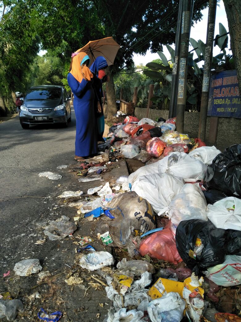 Di Jalan Pondok Ranggon, Kelurahan Harjamukti, Cimanggis, Kota Depok, sampah dibiarkan menumpuk sejak memasuki hari pertama Idul Fitri dan hingga Rabu (20/6) sore.