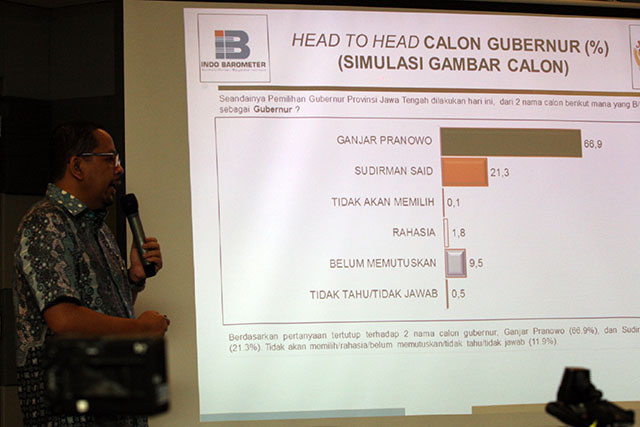 DALAM survei Indo Barometer pasangan calon gubernur dan wakil gubernur Jawa Tengah, Ganjar Pranowo dan Taj Yasin diprediksi akan menang.