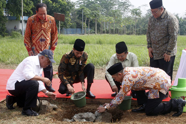 PRESIDEN Joko Widodo dan Wakil Presiden Jusuf Kalla meletakkan batu pertama sebagai tanda dimulainya pembangunan Universitas Islam Internasional Indonesia (UIII) di Jalan Raya Bogor, Kelurahan Cisalak, Sukma Jaya,Kota Depok.