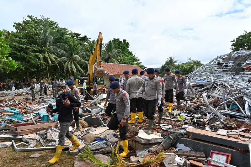 HUJAN deras yang disertai angin kencang terpaksa menghentikan aktivitas tim gabungan TNI, Polri, BNPB, dan Basarnas dalam mencari korban tsunami Selat Sunda di pesisir pantai Kabupaten Pandeglang, Banten, Senin (24/12).