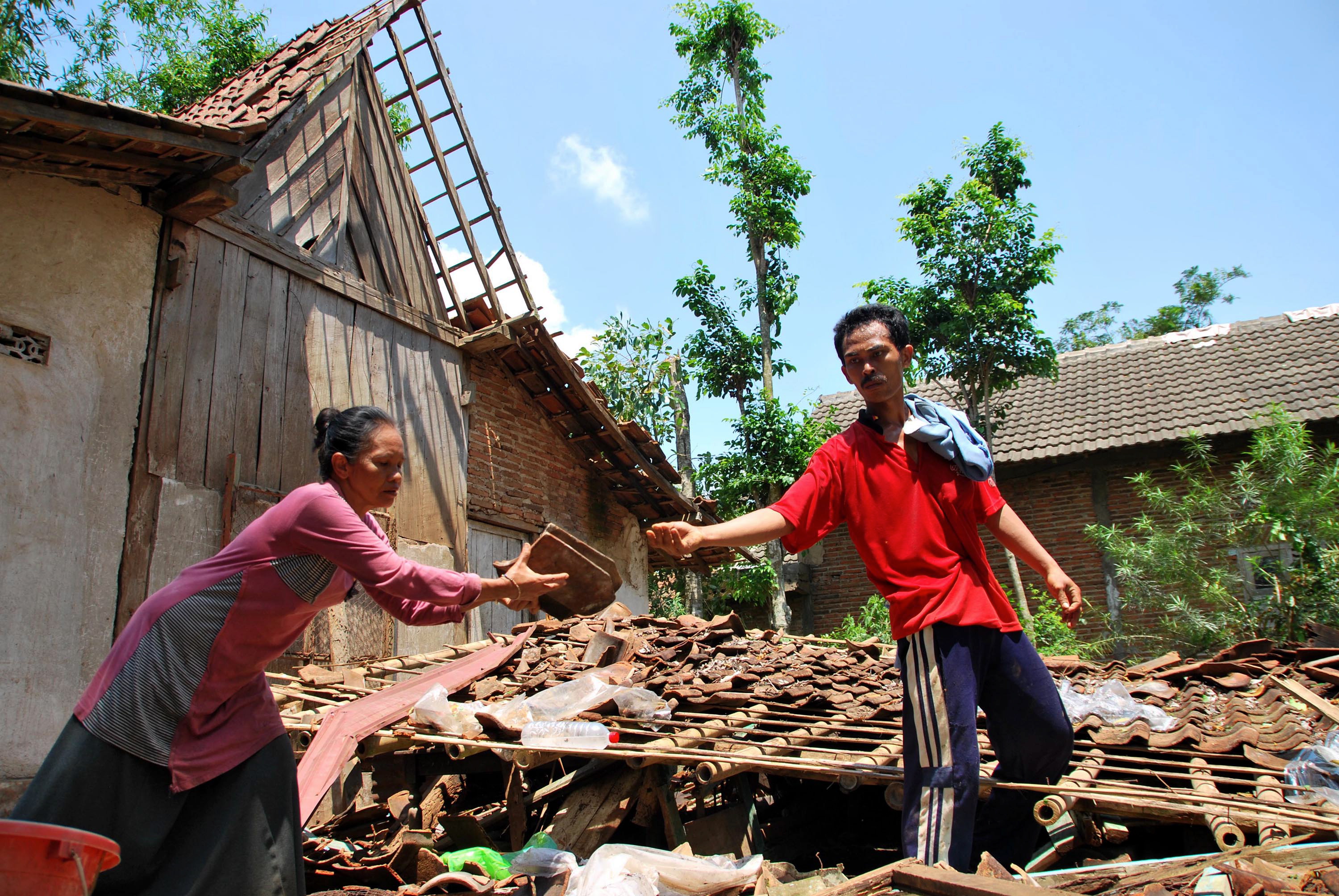 Dua rumah warga rusak parah, satu di antaranya hancur tertimpa pohon saat kejadian.