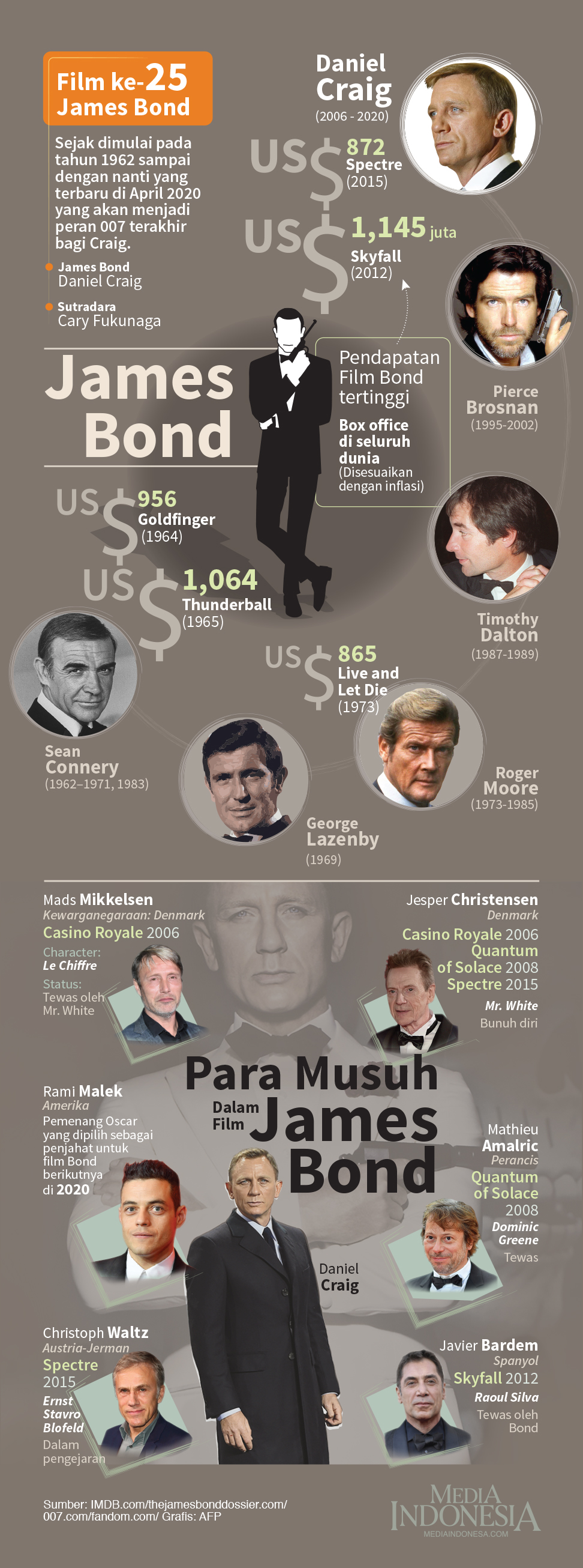 Sejak dimulai pada tahun 1962 sampai dengan nanti yang terbaru di April 2020 yang akan menjadi peran 007 terakhir bagi Craig.