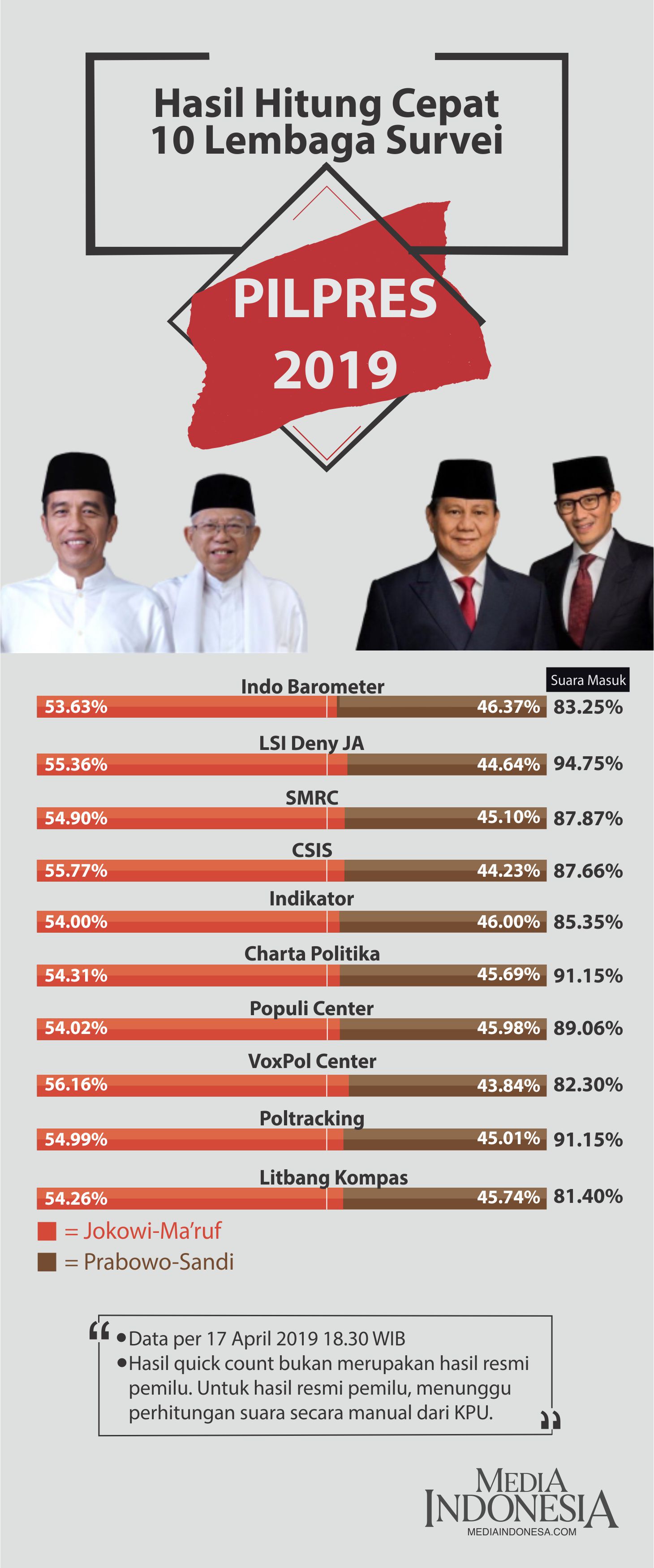 Dari tujuh hitung cepat lembaga survei yang dipantau Media Indonesia, perolehan suara Jokowi-Ma'ruf antara 54%-55%, sedangkan Prabowo-Sandiaga Uno 44%-45%.