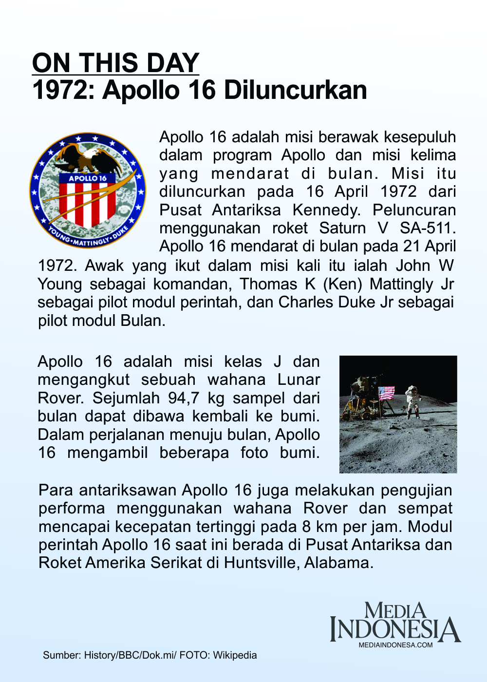 Tepat pada hari ini tanggal 16 April 1972 misi Apollo 16 dilaksanakan.