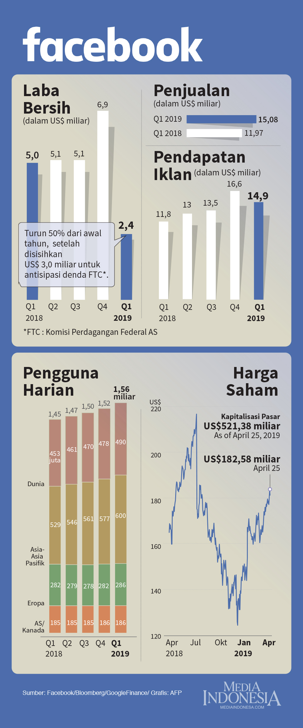 Hasil triwulanan untuk Facebook, dengan penjualan, pendapatan iklan, pengguna harian dan harga saham.