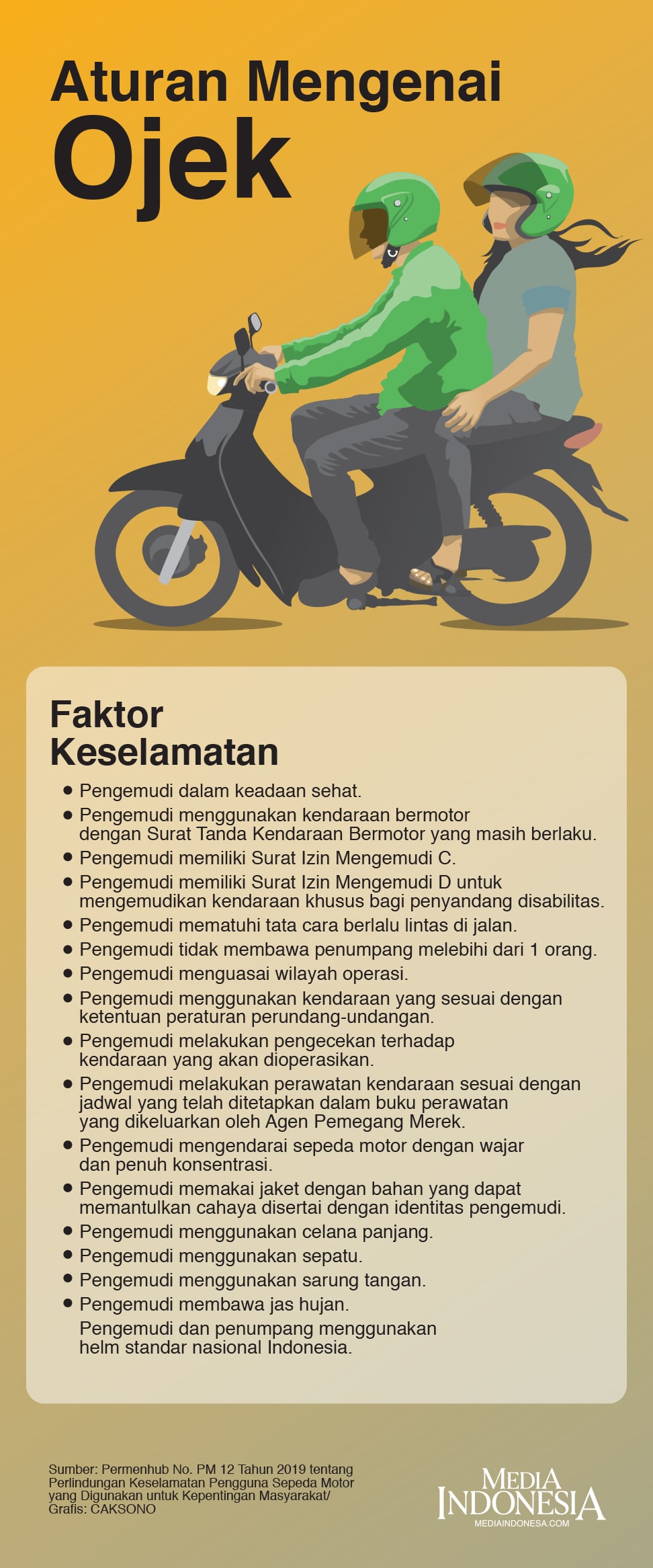 Berdasarkan Peraturan Menteri Perhubungan Nomor PM 12 Tahun 2019 tentang Perlindungan Keselamatan Pengguna Sepeda Motor yang Digunakan untuk Kepentingan Masyarakat.