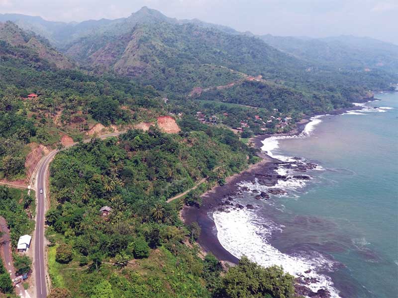 Selain laut, jalur pansela ini menawarkan pemandangan sawah serta air terjun dari Curug Cimarinjung. Untuk sampai ke sana, ada beberapa wilayah desa yang harus dilalui, di antaranya Desa Loji, Desa Giri Mukti, dan Desa Sangrawayang.
