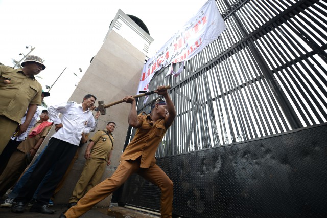 Sebagian pagar Gedung MPR/DPR/DPD yang terletak di Jalan Gatot Subroto, Jakarta, jebol pada Kamis (22/8) saat massa aksi yang menolak RUU Pilkada berusaha masuk komplek parlemen