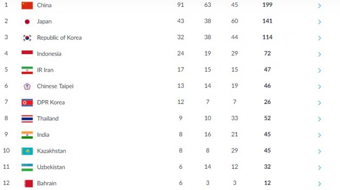 Daftar perolehan medali Asian Games 2018 di Jakarta dan Palembang hingga pertandingan hari kesepuluh, Selasa (28/8).
