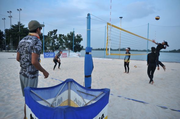 Di hari pertama pertandingan voli pantai di JSC, Indonesia menurunkan empat pasangan atlet putra dan putri.