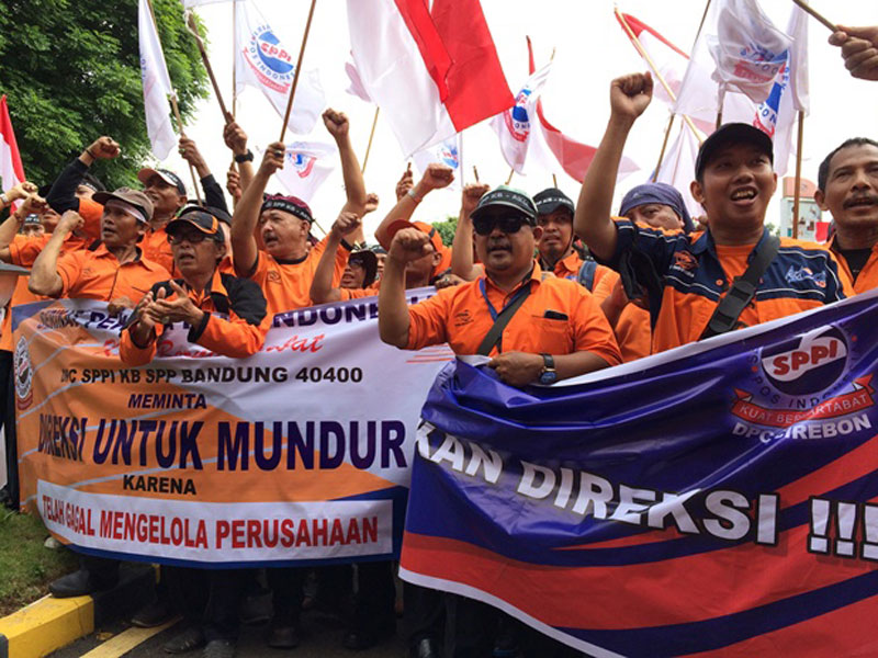 Massa yang mengenakan baju warna oranye ini menuntut penggantian direksi karena dianggap tidak memuaskan para pegawai dan tidak mampu memenuhi hak pegawai.