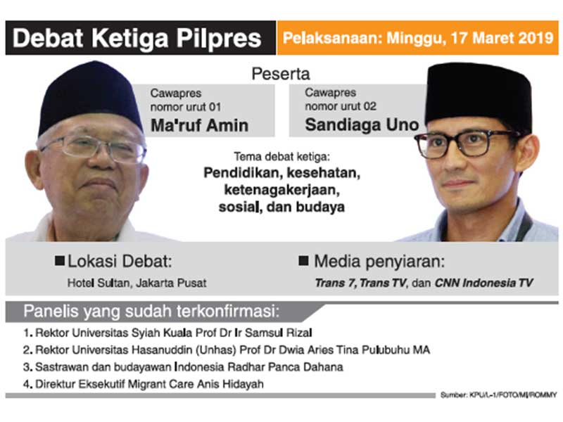 Hanya Ma'ruf Amin dan Sandiaga Uno yang akan tampil di debat ketiga Pilpres 2019.