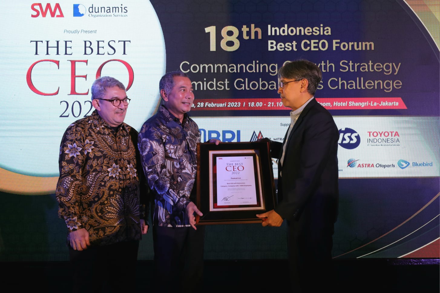 Dirut BRI Sunarso, mendapatkan penghargaan bergengsi Best CEO with Distinction untuk kategori Company With More Than 1.000 Employees dalam ajang Indonesia Best CEO 2022.