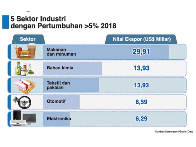Pertumbuhan lima sektor industri di atas 5% dan memiliki catatan kinerja ekspor gemilang di 2018.