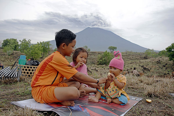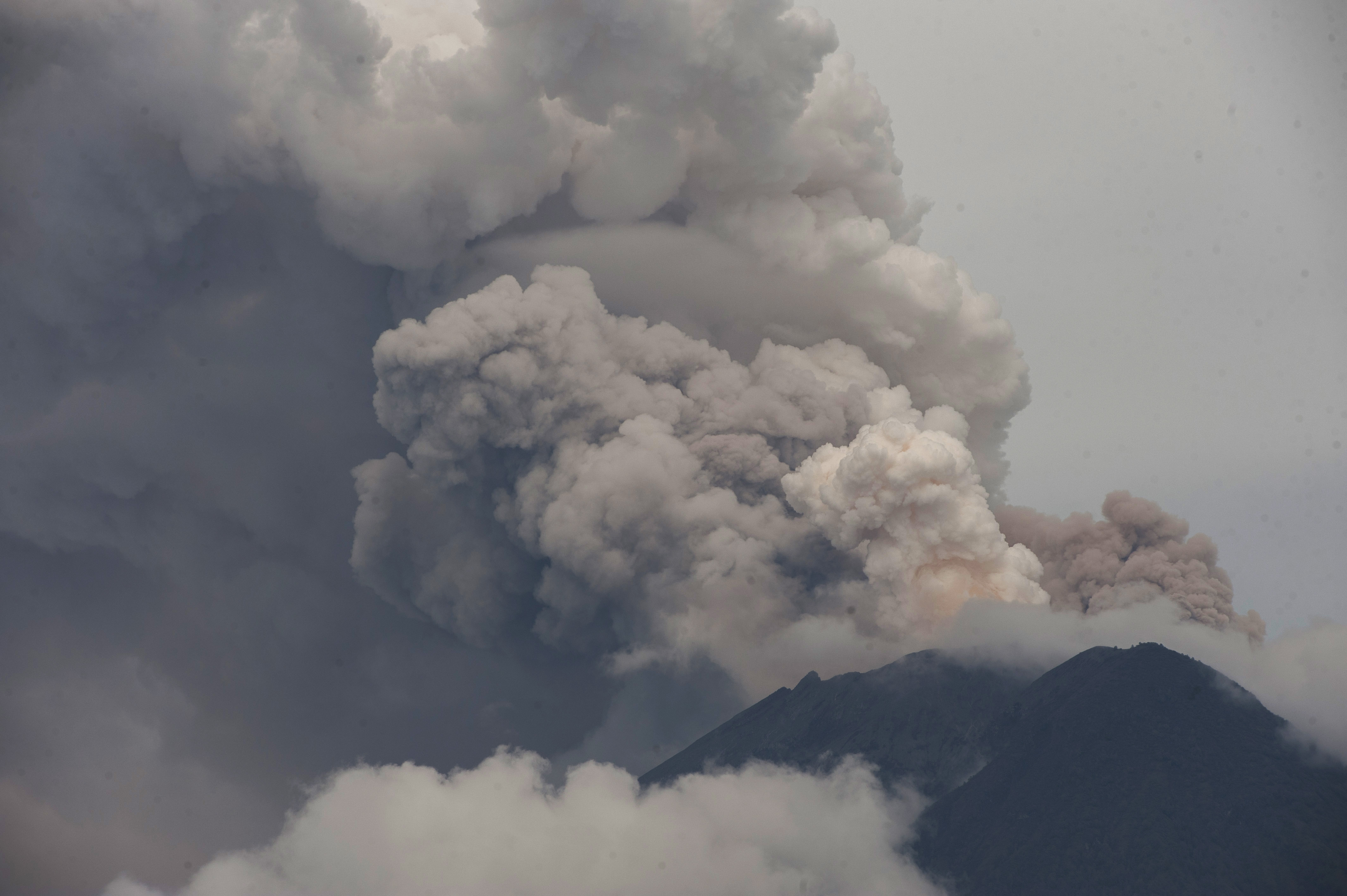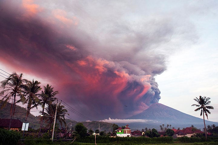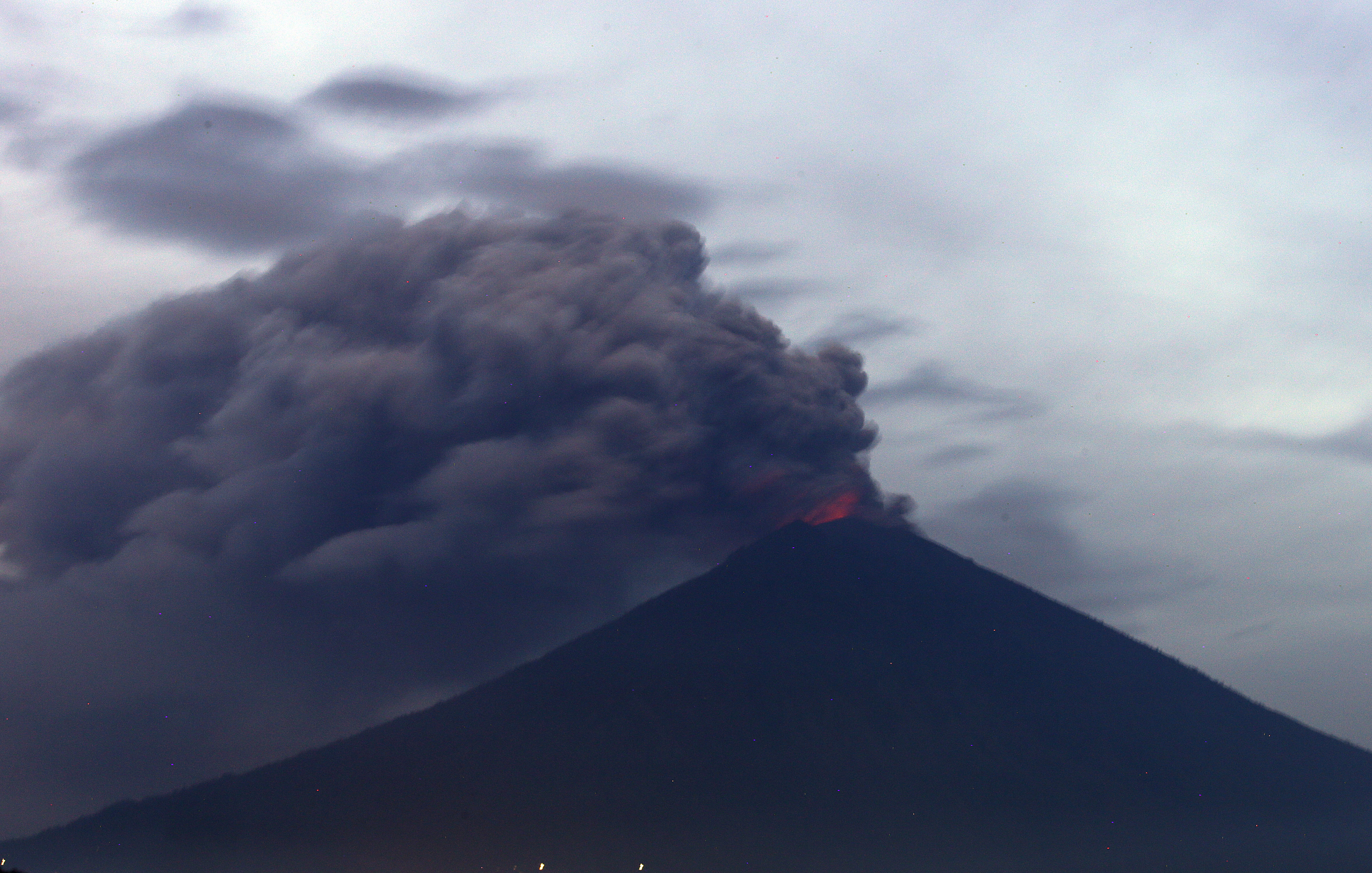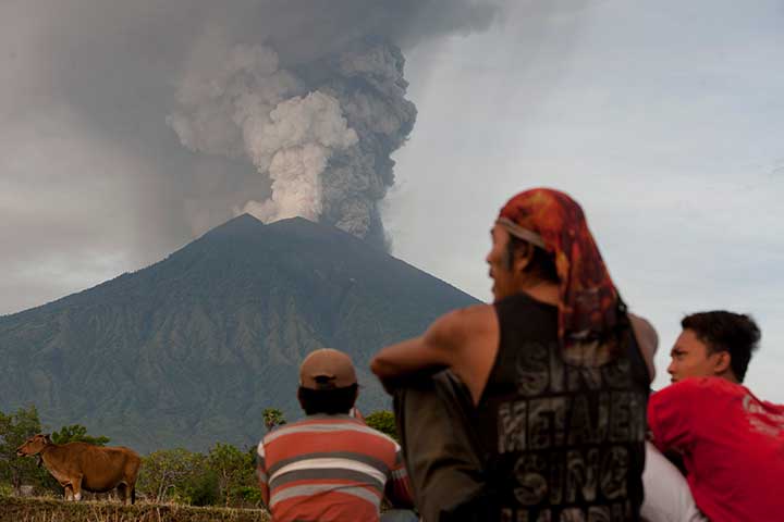 ERUPSI Gunung Agung di Karangasem, Bali, terus terjadi. Hingga pagi ini Rabu (29/11), Gunung Agung terus mengeluarkan debu vulkanik dengan ketinggian sekitar 3 ribu sampai 4 ribu meter dari puncak kawah. Bahkan, sesekali pijaran api terus kelihatan menyembur ke udara bersama dengan semburan abu vulkanik.