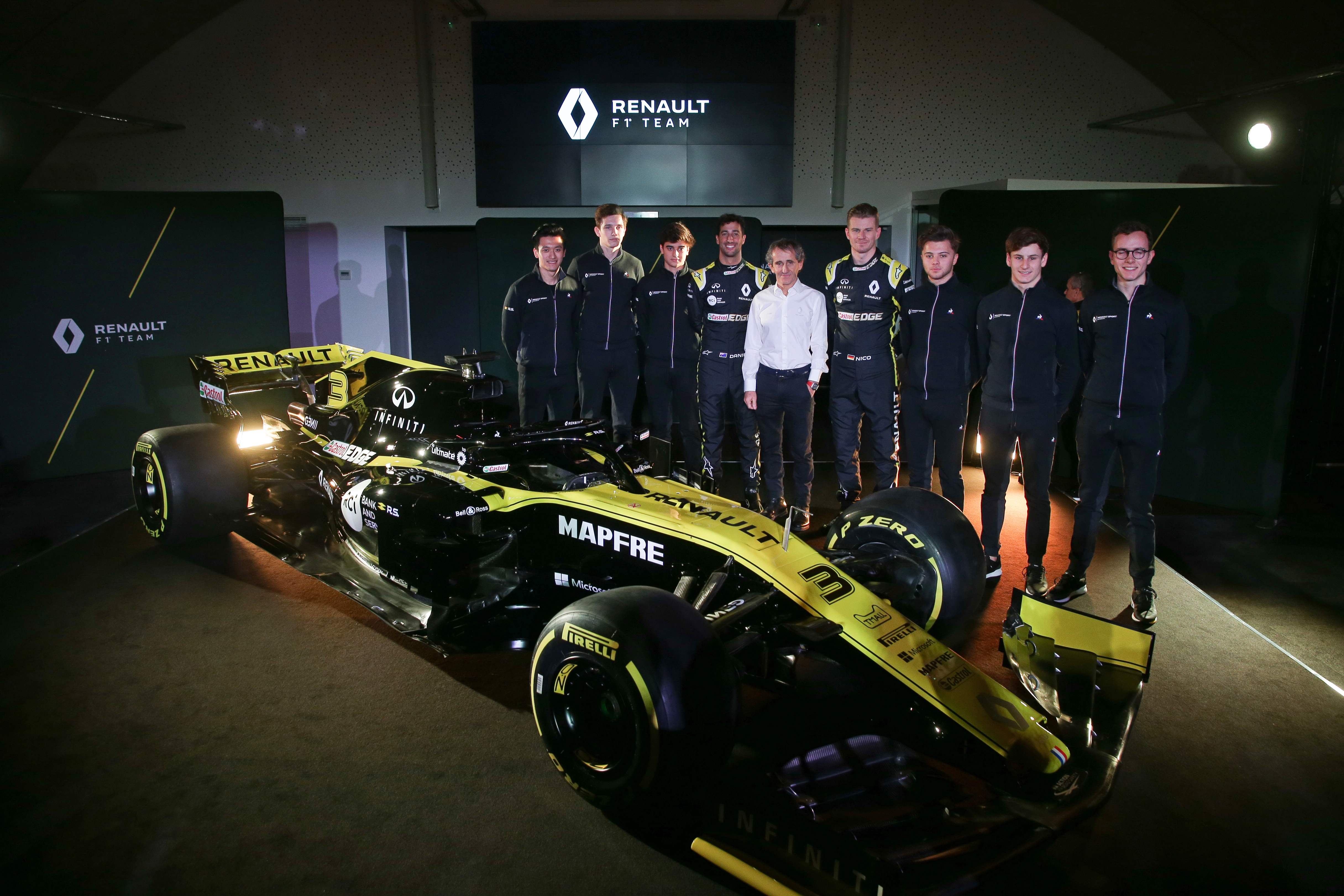 Ricciardo bersama Hulkenberg menyibak tirai penutup mobil penantang baru Renault di pabrik Renault di Enstone, Inggris Raya, Selasa (12/2).