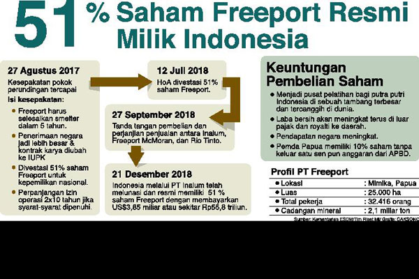 Inalum pada Jumat (21/12) meningkatkan kepemilikannya di PTFI dari 9,36% menjadi 51% dengan membayar US$3,85 miliar atau Rp55 triliun dan menjadi pengendali perusahaan yang memiliki tambang Grasberg di Papua dengan kekayaan emas, perunggu dan perak sebesar Rp2,400 triliun hingga 2041.