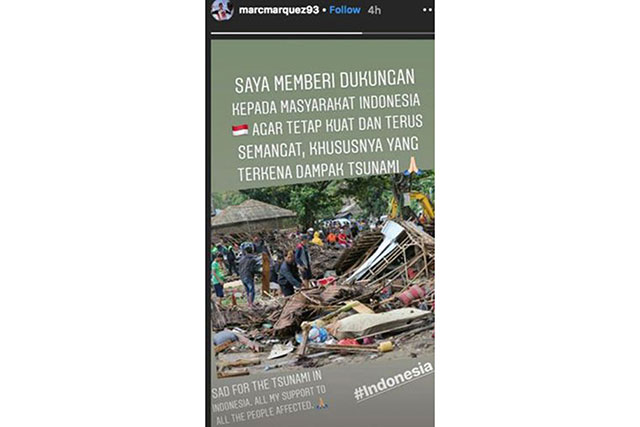 Dalam akun Twitter resminya, para pembalap Moto GP ini menyampaikan ucapan belasungkawa sekaligus memberi semangat Indonesia untuk tetap kuat dan tegar.