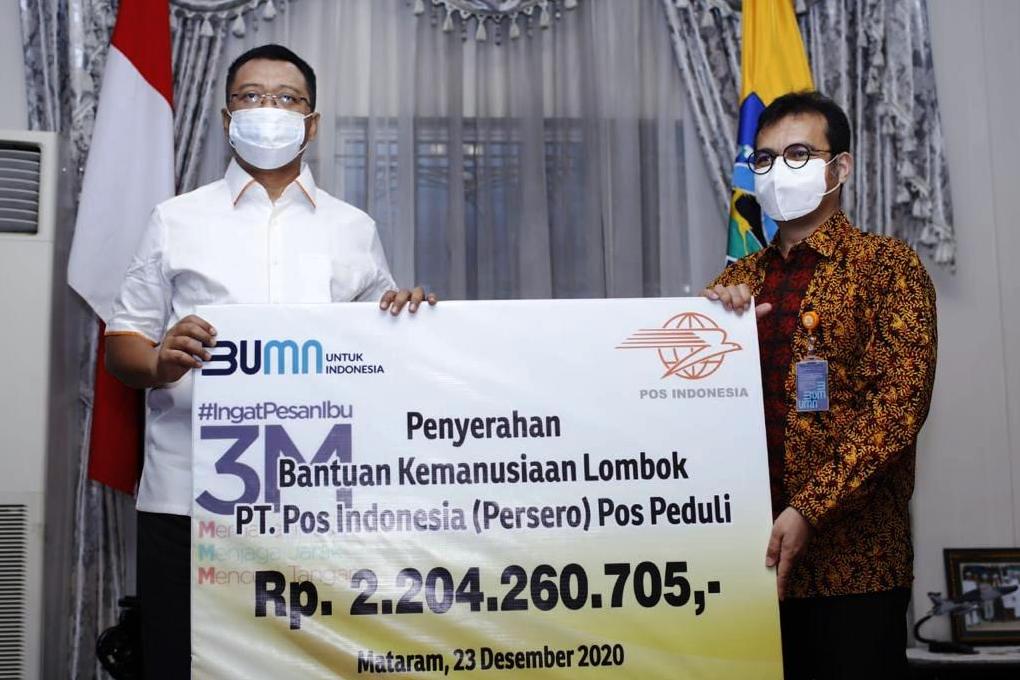 Penyerahan donasi dilakukan secara simbolis oleh Direktur Kelembagaan PT Pos Indonesia Nezar Patria kepada Gubernur NTB, H.Zulkieflimansyah di Kantor Gubernur NTB, Rabu (23/12).