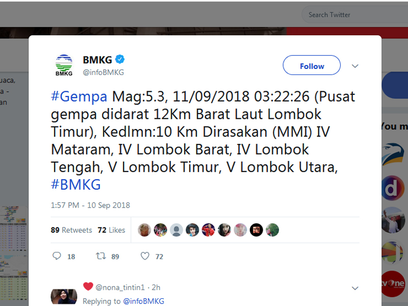 Gempa tersebut menyebabkan warga di Kota Mataram, berhamburan keluar rumah karena khawatir bangunan roboh.