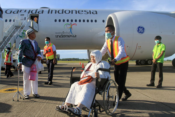 GARUDA Indonesia yang membawa 392 jamaah haji kloter 1 debarkasi Padang, Sumatra Barat, tiba di Bandara Internasional Minangkabau, Kamis (7/9) pagi. Anggota kloter ini awalnya 393 orang, namun meninggal 1 orang.