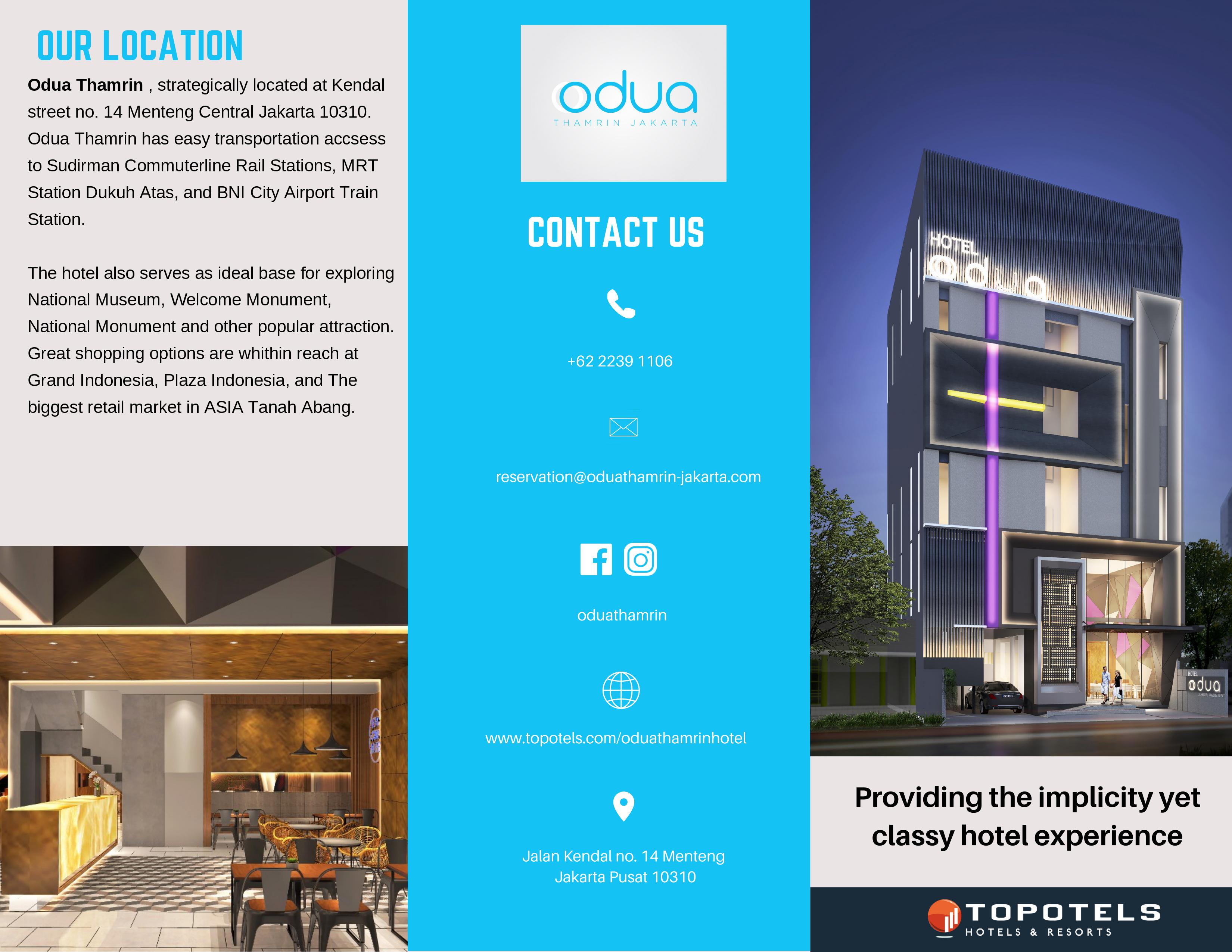 Manajemen hotel berniat mengenalkan Hotel Odua Thamrin kepada masyarakat luas dengan berbagai diskon yang bisa didapatkan. Diskon soft opening rates dapat dilihat di www.topotels.com.