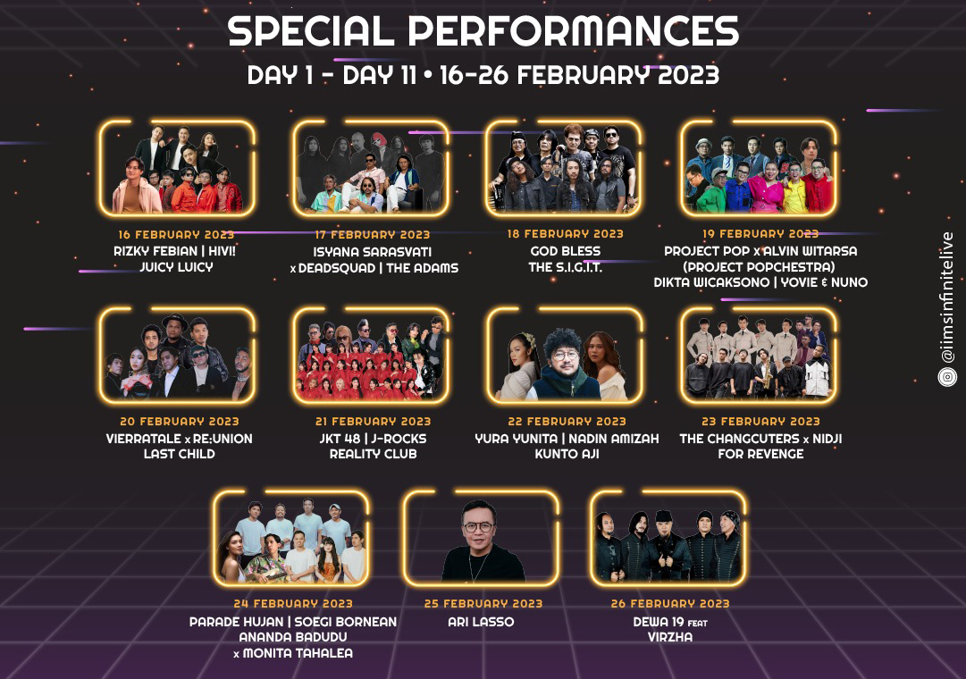 Kemeriahan IIMS Infinite Live pada hari ketiga (18/02) masih berlanjut dengan kehadiran God Bless dan The Sigit di area IIMS Infinite Live yang dibuka pukul 16:00 WIB setiap harinya.