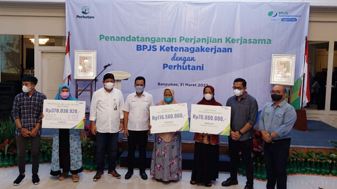 Dalam kesempatan tersebut BPJAMSOSTEK juga sekaligus menyerahkan santunan kepada 3 ahli waris dari pekerja di sektor kehutanan yang meninggal dunia karena kecelakaan kerja.