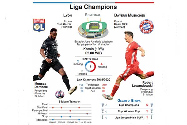 BAYERN Muenchen akan menghadapi tim kuda hitam Lyon pada babak semifinal Liga Champions, Kamis (20/8) dini hari WIB