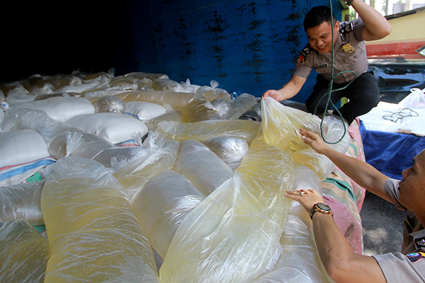 Miras tersebut dikemas dalam delapan karung dan diisikan dalam kantung plastik.