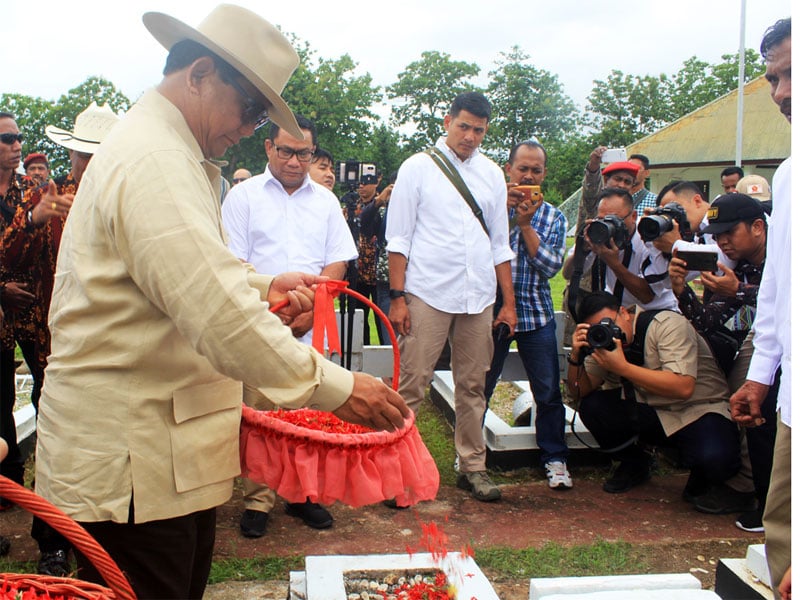 Tiba bandara, Prabowo disambut tarian adat Belu dan sejumlah rekannya yang pernah bersama-sama Prabowo saat bertugas di eks Provinsi Timtim, di antaranya Silvino Taran, Rui Lopez, Wida Sarmento dan Alfonso Pinto.
